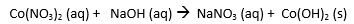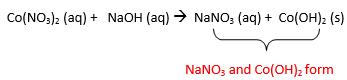 For example if an aqueous solution of cobalt (II) nitrate is mixed with sodium hydroxide, the two aqueous (soluble) solutions will react to form new compounds via a double displacement reaction, forming an insoluble product—the precipitate.