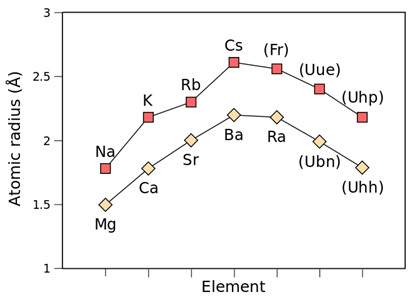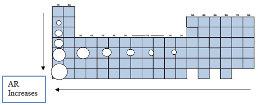 From top to bottom, the “n” or shells increase, thereby increasing the space between the nucleus and the valence shell, also extending the AR.
